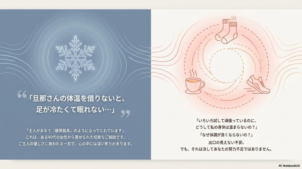 つまり、足先が冷たいのは、あなたの身体が必死に「お腹の中の大事な機能」を守ろうと戦っている証拠。ご主人の体温を借りなければならないほど冷えているのは、それだけ身体の「芯温」の余裕がなくなっているサインなのです。