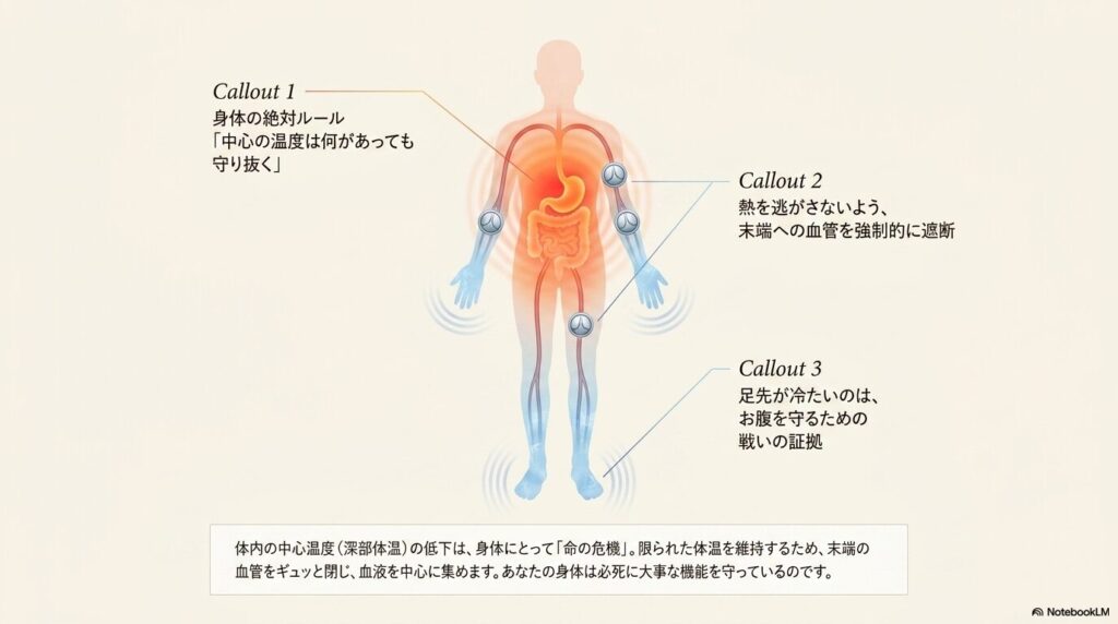 1. 身体は「大事な場所」を優先して守る私たちの身体には、生命を維持するために最も重要な「内臓(体幹)」の温度を、何があっても一定に保とうとする仕組みがあります。