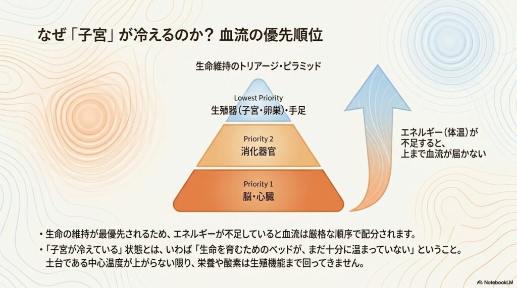 「子宮が冷えている」というのは、いわば**「生命を育むためのベッドが、まだ十分に温まっていない状態」**。一生懸命に妊活や健康管理に取り組んでいても、まずは身体の土台である「中心の温度」を上げてあげなければ、栄養や酸素を運ぶ血液が子宮までスムーズに届かないのです。