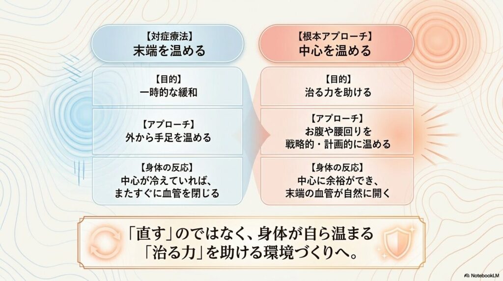 大切なのは、外から一時的に温めることだけではありません。身体が「もう手足の血管を閉じなくても、お腹は十分に温かいから大丈夫だ」と安心できる状態の「温め続ける」を作ってあげることです。