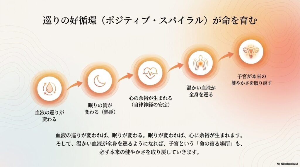 血液の巡りが変われば、眠りの質が変わります。眠りが変われば、心の余裕が生まれます。そして、温かい血液が全身を巡るようになれば、子宮という「命の宿る場所」も、本来の健やかさを取り戻していくはずです。