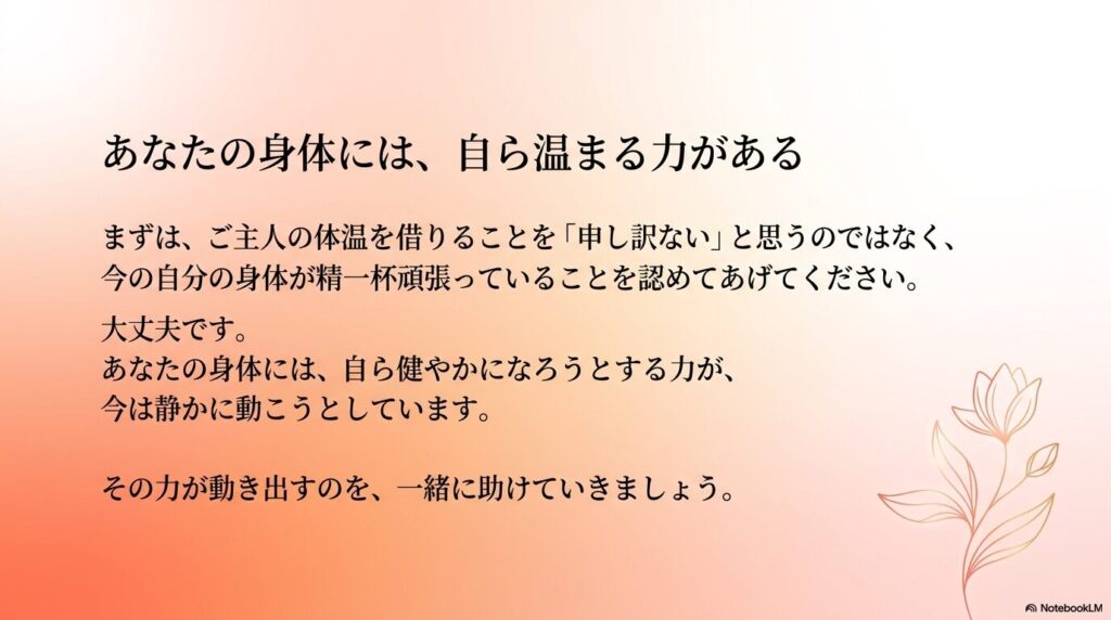 まずは、ご主人の体温を借りることを「申し訳ない」と思うのではなく、今の自分の身体が精一杯頑張っていることを認めてあげてください。
