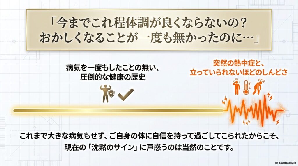 これまで健康だったからこそ、「自分は大丈夫」という思い込みが、休息のタイミングを遅らせてしまいます。このまま放置すると、さらに深刻な事態を招きかねません。