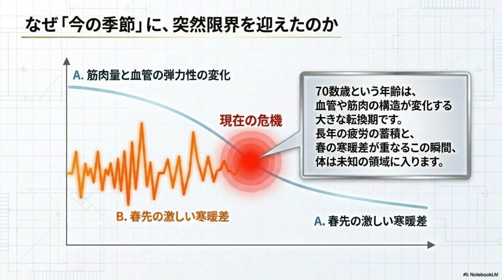 70数歳という年齢は、筋肉量や血管の弾力性が変化する大きな転換期です。特に春先は寒暖差が激しく、長年積み重なった「肩甲骨の固着」が限界を迎え、呼吸や血流をさらに悪化させています。