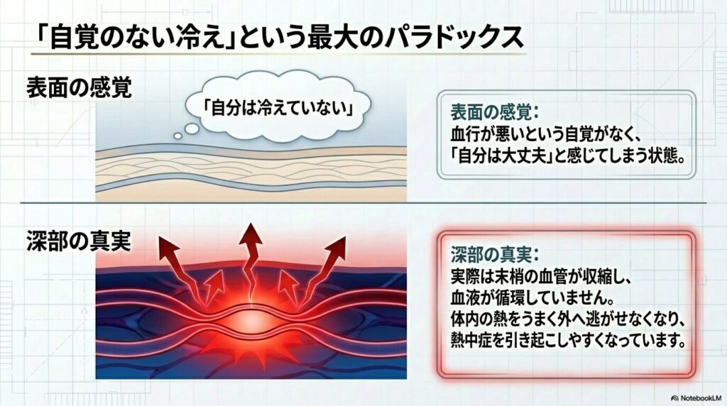 「自分は冷えていない(血行が悪いと思っていない)」と感じるのは、実は深部体温の調節機能が低下している可能性があります。