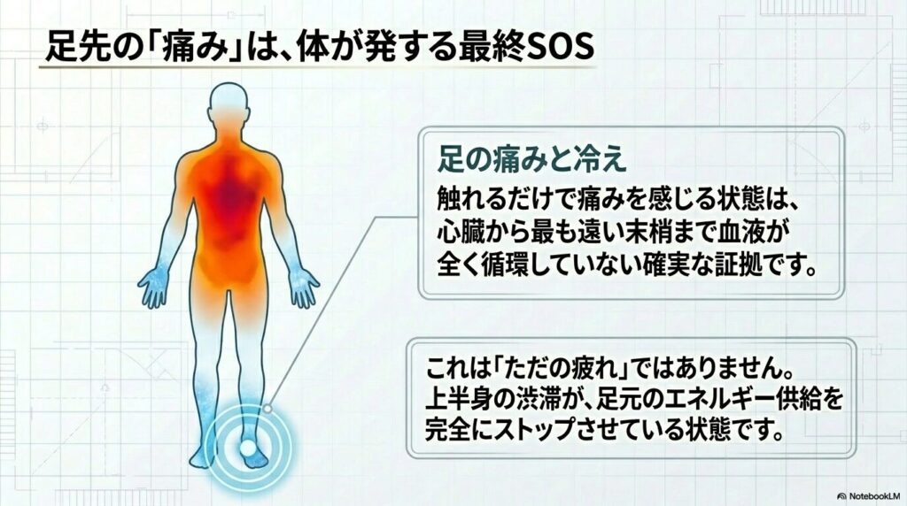 ご本人は「冷えている(血行が悪い)」という自覚がありませんが、足の血行が悪く、触れると痛みを感じる状態は、末梢まで血液が循環していない証拠です。
