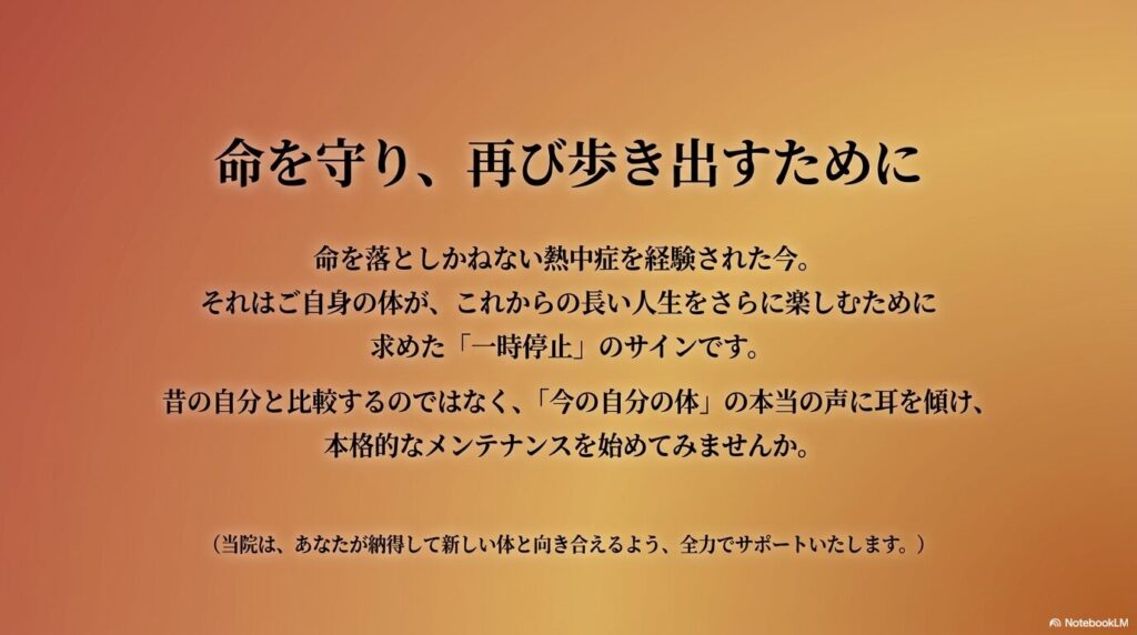 しかし、昨年の熱中症、そして「立っていられないほどのしんどさ」は、体が命を守るために出している切実なSOSです。