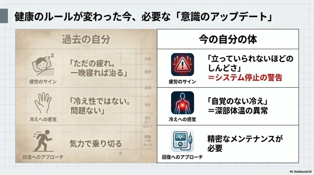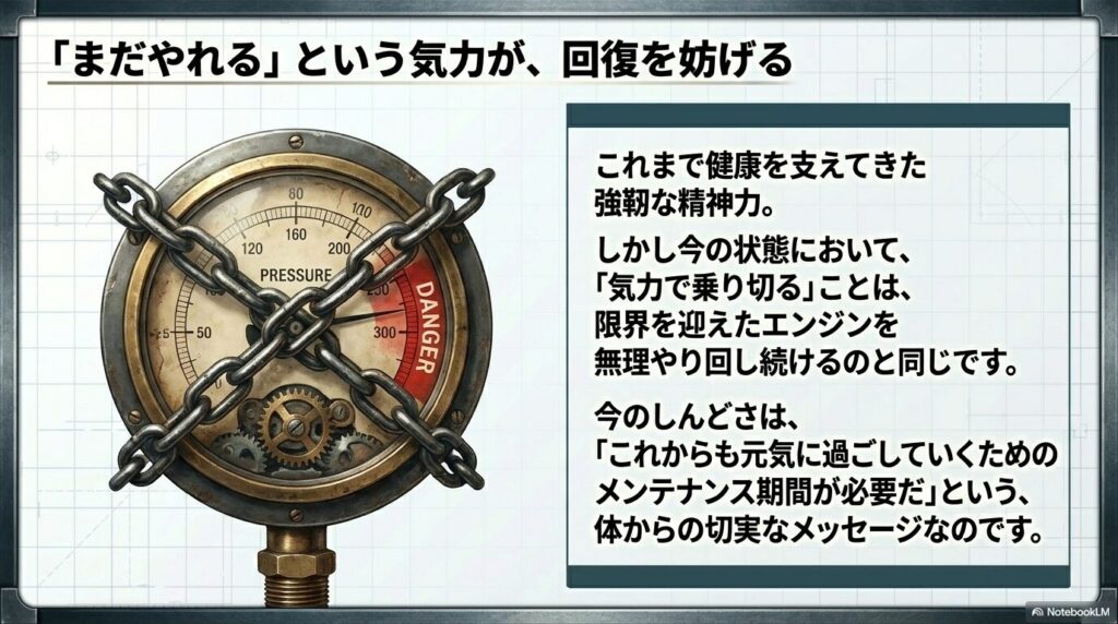 「まだやれる」という気力が、時に体の回復を妨げてしまうことがあります。今のしんどさは、これからも元気に過ごしていくための「メンテナンス期間」が必要だという、体からのメッセージです。
