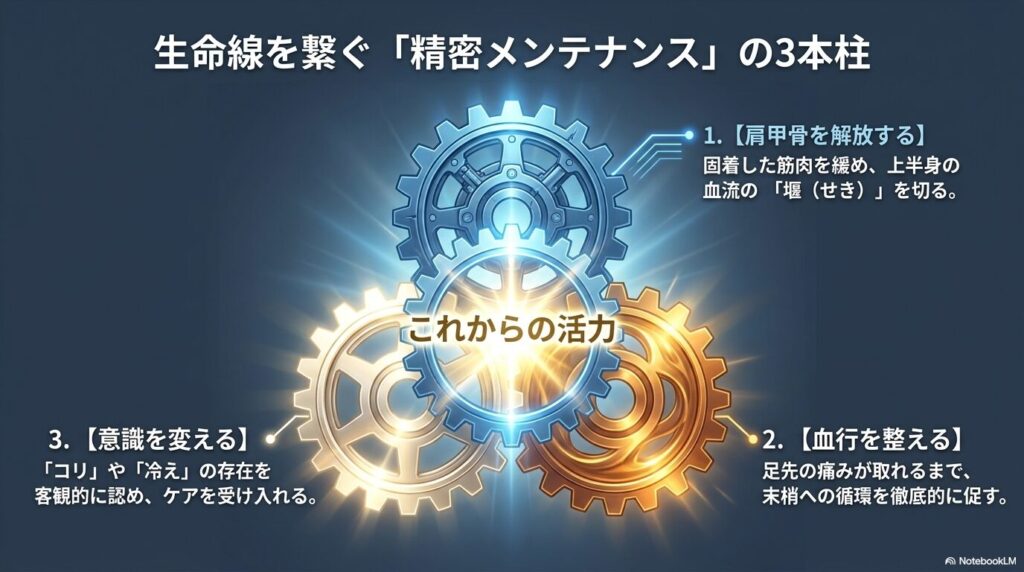 - 意識を変える: 「冷え」や「コリ」を認め、ケアを取り入れること。