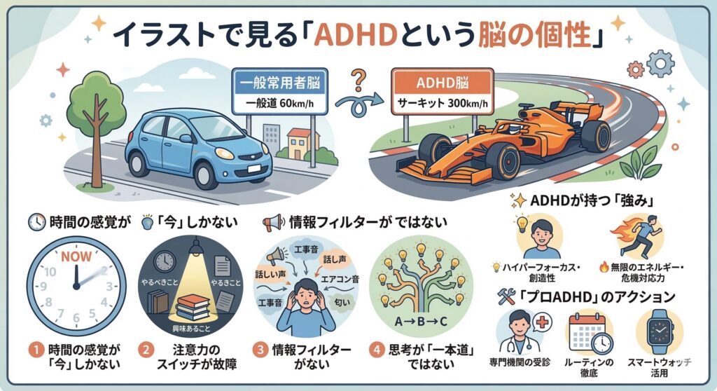 🏎️ 1. ADHDは「脳の特性」:普通の車とF1カーの違い