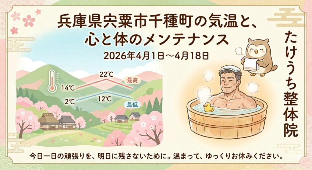 4月上旬は三寒四温の影響で、日によっては最低気温が氷点下近くまで下がることもありますが、中旬以降(4月14日〜)は移動性高気圧に覆われやすく、最高気温が**20℃**を超える小春日和が続いています。千種町は山間部に位置するため、同じ宍粟市内でも山崎町などの市街地より2〜3℃ほど低くなる傾向があります。外出の際は、脱ぎ着しやすい服装をおすすめします。