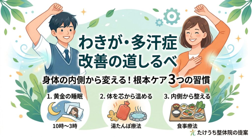この時間は、身体の細胞が新しく生まれ変わる「修復のゴールデンタイム」です。勉強や仕事で忙しい毎日ですが、この時間を中心に眠ることで、自律神経が整い、汗のコントロールがしやすくなります。 - 「湯たんぽ」で身体を芯から温める