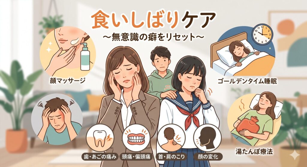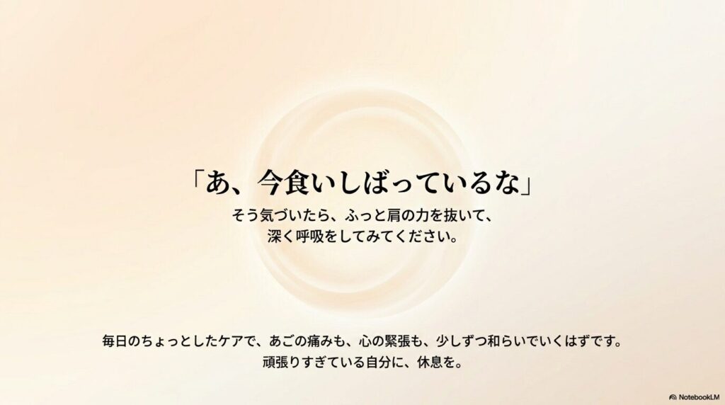 「あ、今食いしばっているな」と気づいたら、ふっと肩の力を抜いて、深く呼吸をしてみてください。毎日のちょっとしたケアで、あごの痛みも、心の緊張も、少しずつ和らいでいくはずです。