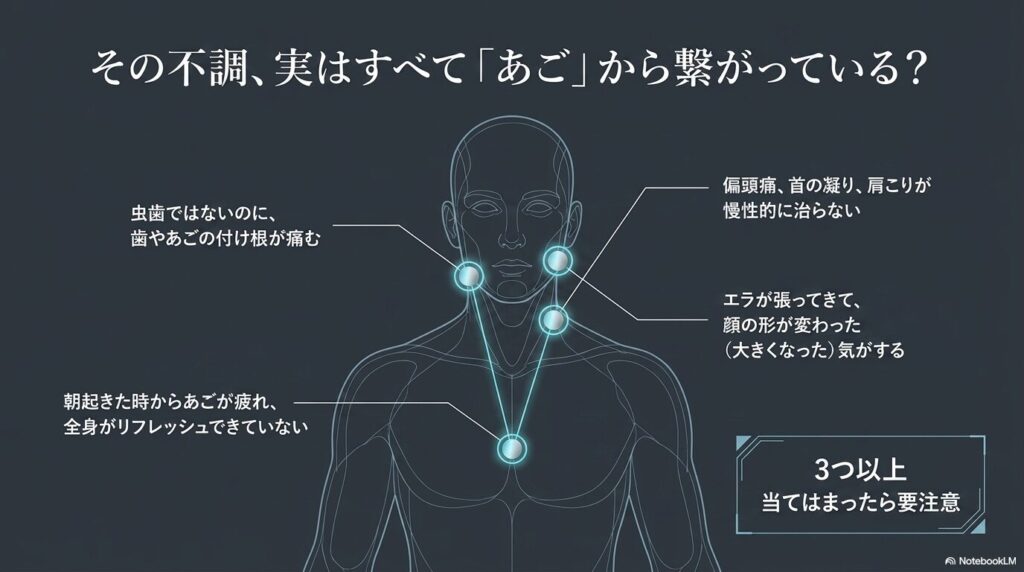 - 疲労感: 朝起きた時から、あごが疲れていてリフレッシュできていない。