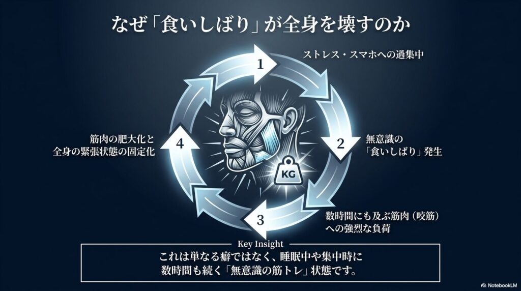 そんな悩みはありませんか? 実はそれ、寝ている間や集中している時に無意識に行っている**「食いしばり(歯ぎしり)」**が原因かもしれません。