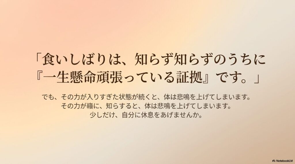 食いしばりは、知らず知らずのうちに**「一生懸命頑張っている証拠」**でもあります。