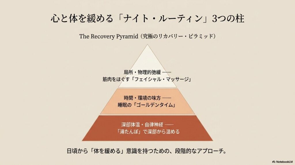 体を内側から温めることで、自律神経が整い、筋肉の緊張が解けやすくなります。