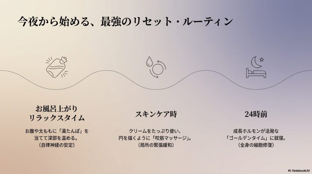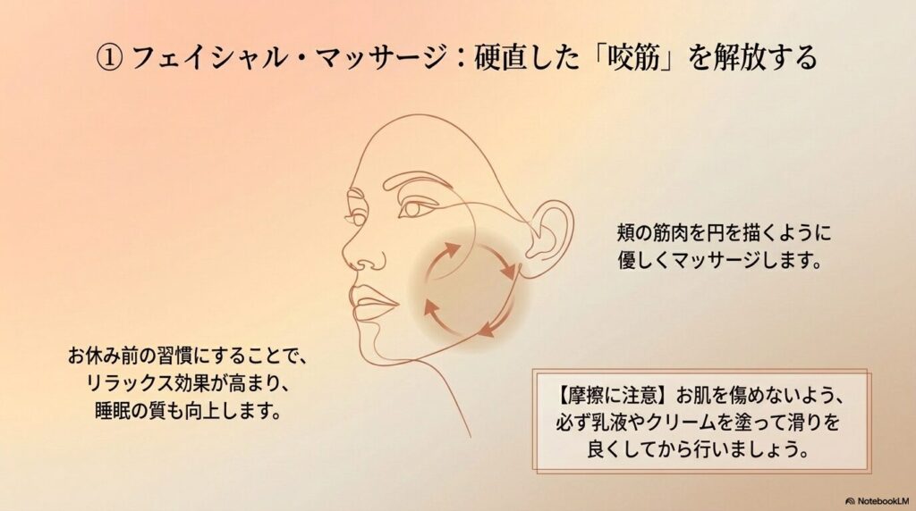- やり方: 頬の筋肉を円を描くように優しくマッサージ。お休み前の習慣にすると、リラックス効果で睡眠の質も上がります。