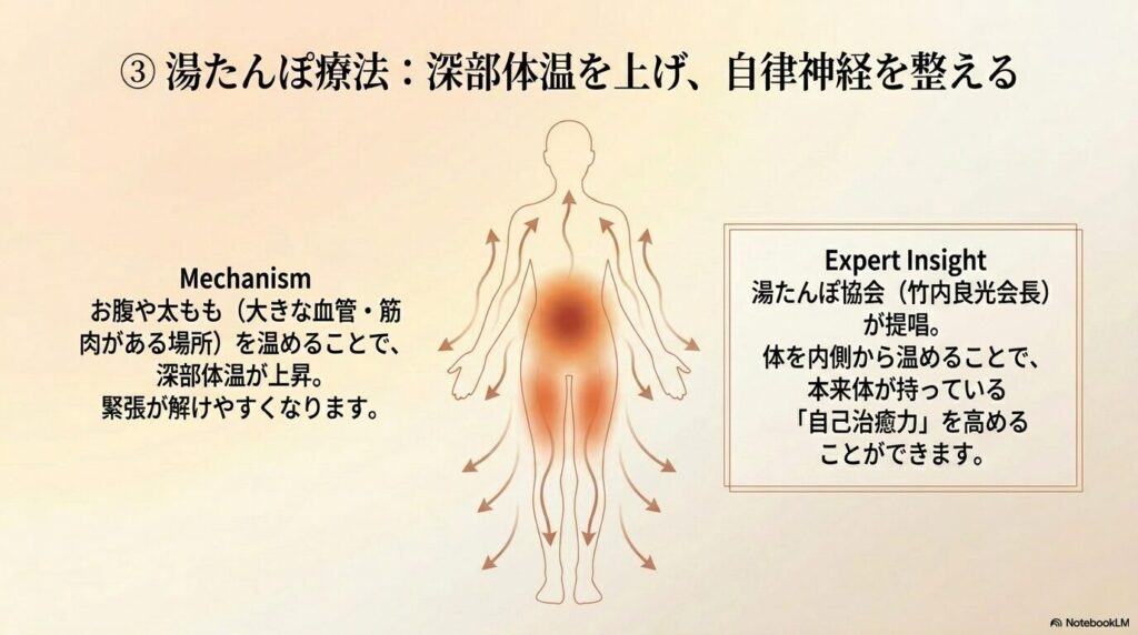 - 湯たんぽ療法: 湯たんぽ協会(竹内良光会長)が提唱するように、お腹や太ももなどを温めて体温を上げることで、本来体が持っている「自己治癒力」を高めることができます。