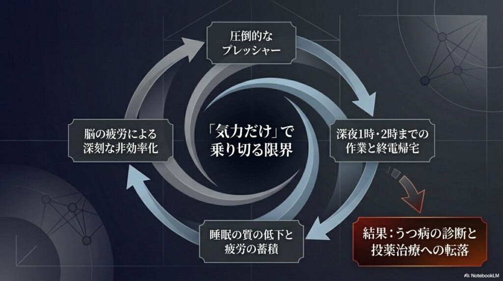 体力を回復させるための「睡眠のゴールデンタイム(午後10時〜午前3時)」に眠ることは叶わず、疲労困憊の極みにありました。うつ病の診断を受け、病院で薬をもらいながら、なんとか気力だけで仕事に向き合っておられたのです。