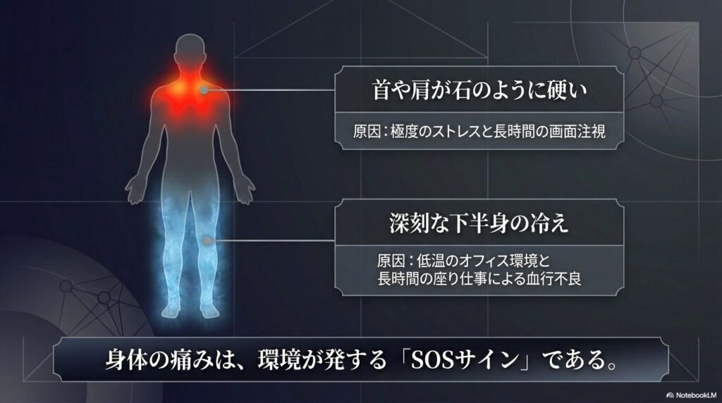首や肩のコリ、足腰の冷えは、あなたの心と体が発している限界のサインです。