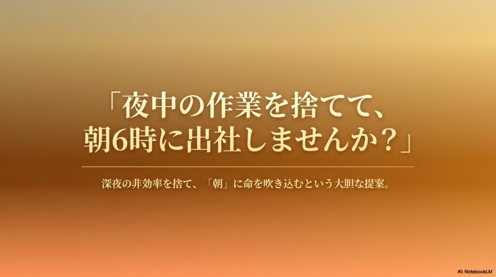 「夜中の作業を捨てて、朝6時に出社しませんか?」