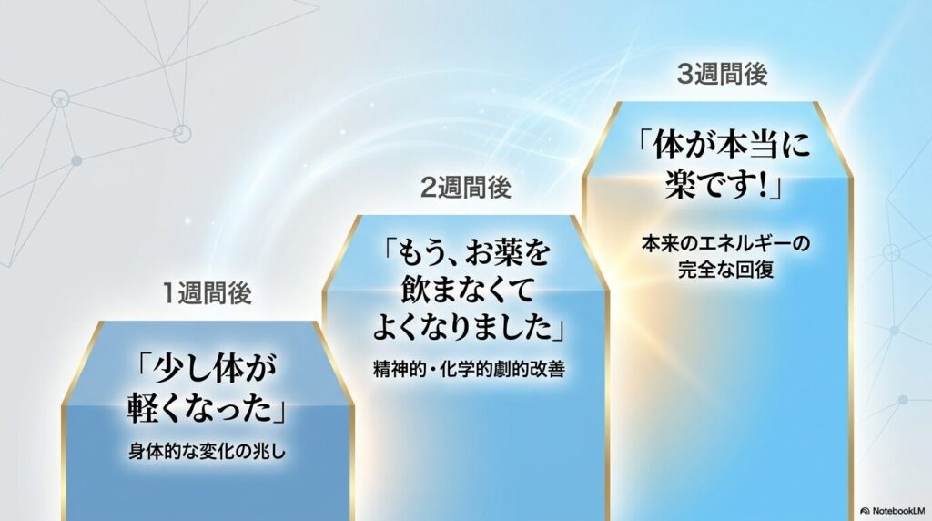 - 1週間後: 「少し体が軽くなった」と、変化を感じ始めました。
