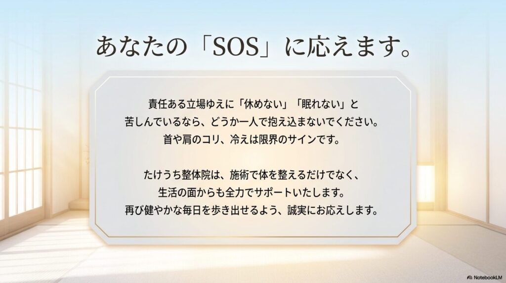 もし今、この記事を読んでいるあなたが、責任ある立場ゆえに「休めない」「眠れない」と苦しんでいるのなら、どうか一人で抱え込まないでください。