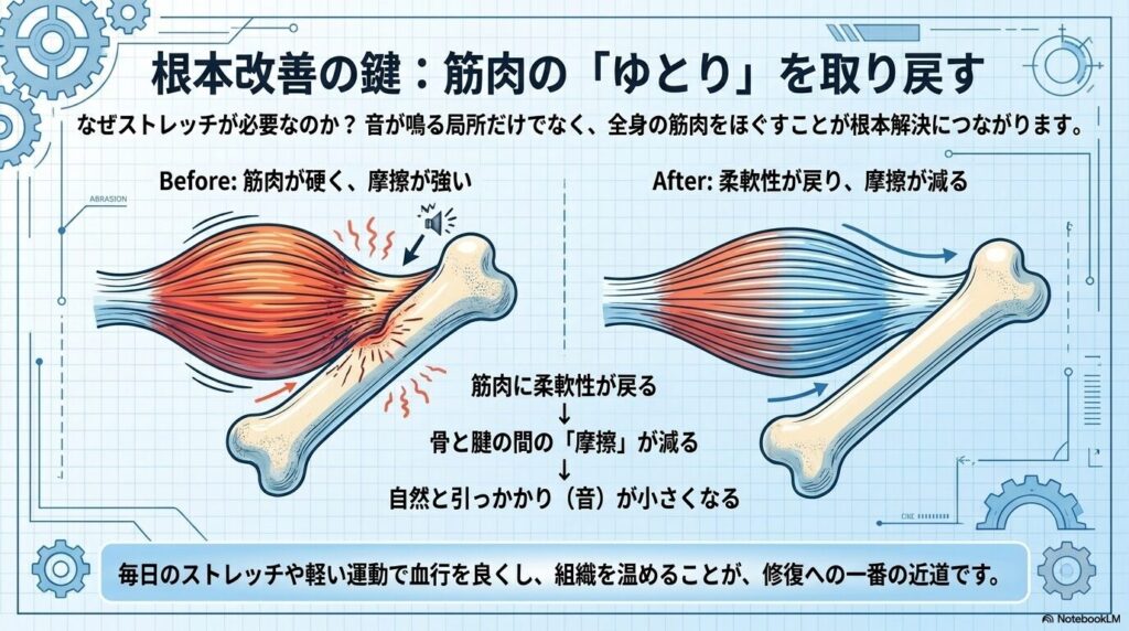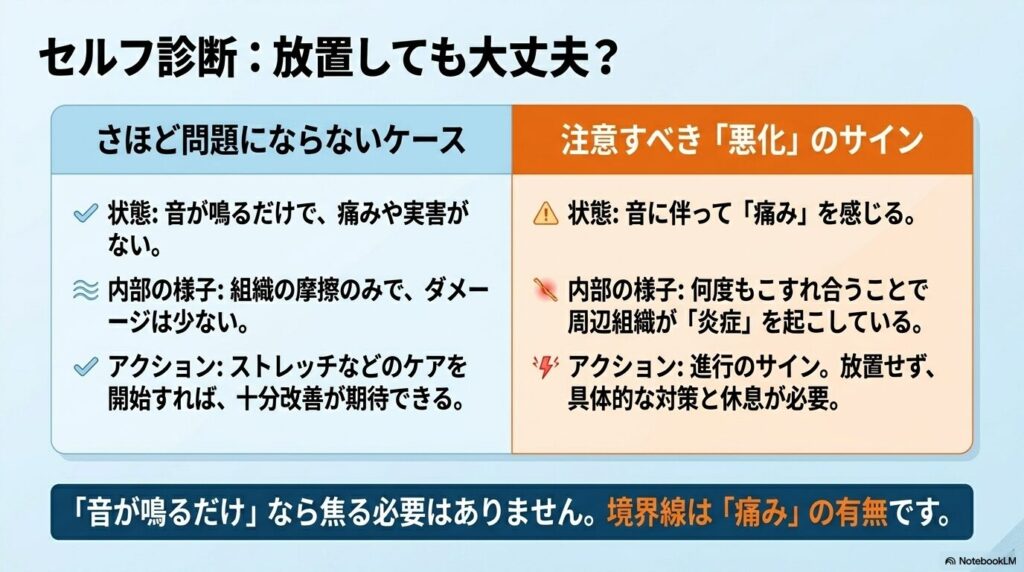 • さほど問題にならないケース:音が鳴るだけで、痛みや「引っかかって動かない」といった実害がない場合。この段階でストレッチなどのケアを始めれば、十分に改善が期待できます。