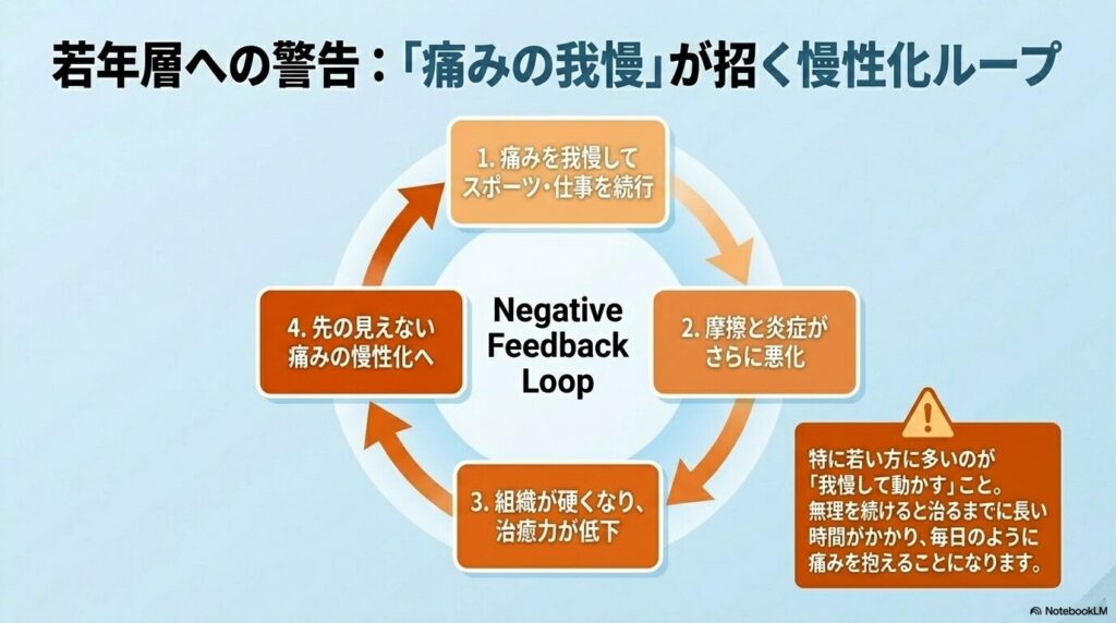 特に若い方の場合は、痛みを我慢して仕事、スポーツを続けると慢性化し、治るまでに長い時間がかかるようになってしまいます。時には、先の見えない痛みの毎日を迎えるようになります。
