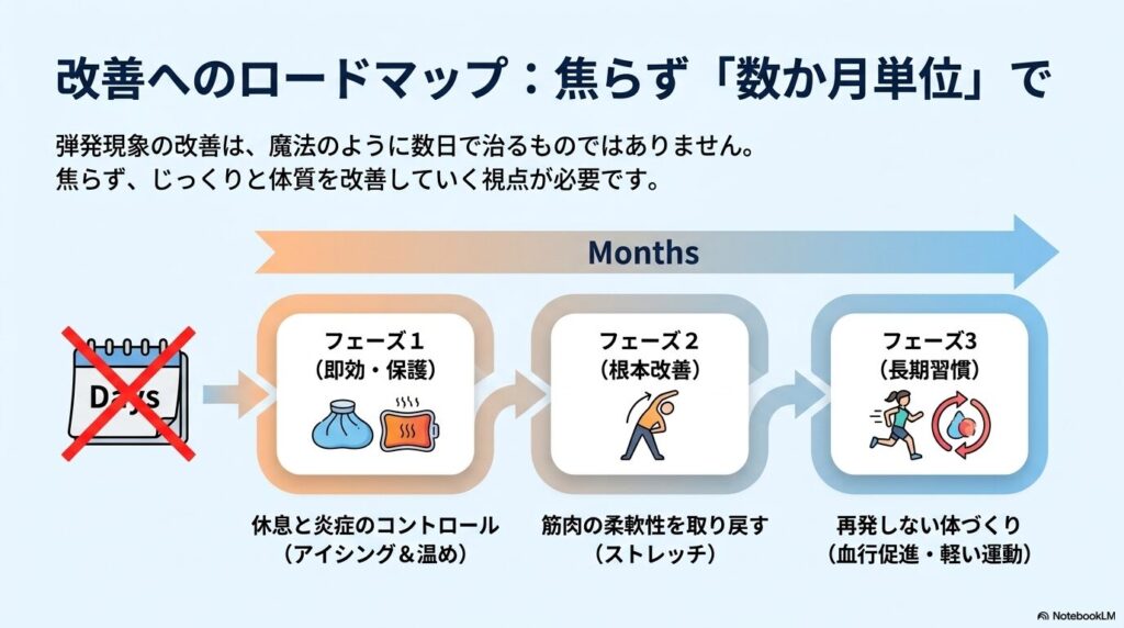 弾発現象の改善には、焦らずに**「数か月単位」**でもじっくり取り組むことが大切です。