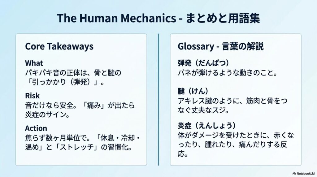 • 引っかかり現象: 筋肉や腱が、骨の出っ張りに「弓の弦」のように引っかかり、それを乗り越える瞬間に「パキッ」と弾ける音がします。
