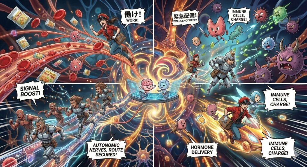 - ホルモン(手紙のやり取り): 血液の流れに乗り、細胞や免疫部隊へ「今はここを修理しよう」という具体的な「相談と提案」を届けます。